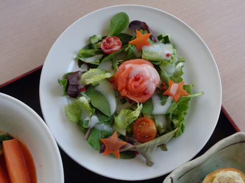 昼食では、パエリアやクリスマスリースサラダなどの華やかな料理が並び、クリスマスを感じるメニューでした。特にリースサラダは盛り付けがとても可愛らしく、お花に見立てたサーモンも綺麗でした。お誕生日を迎えられた皆様、おめでとうございます☆
