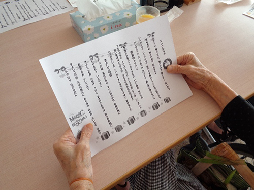 クリスマス会では、「ジングルベル」などのクリスマスソングや、讃美歌の「きよしこの夜」などを合唱しました。入居者の皆様と一緒にクリスマスを祝うことができたこと、嬉しく思います。