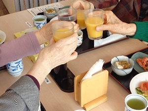 同じ食席の入居者様同士で乾杯したり、ご夫婦で顔を見合わせて乾杯したり、お誕生月の入居者様のもとへ足を運んで乾杯したり…。