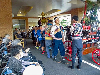 柿崎地区の皆様のご厚意により、毎年施設前で神輿や太鼓を披露いただいております。