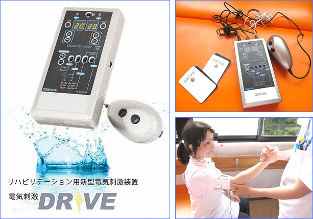 リハビリ用新型電気刺激装置DRIVEは、麻痺した手足に対して専用の電気刺激を流すことで、筋の収縮を発生させ回復を促す最新の治療機器となります。 電気は低周波治療器に類似した機構であり、リハビリテーションの動きに合わせて、運動や作業で必要な筋に電気を流し、目的となる運動をアシストするような形や、麻痺して動かない筋に電気を流し、受動的に運動を誘発させ金を収縮させる練習など、多岐にわたる目的で使用する事ができます。 これら電気刺激装置の治療効果は脳卒中治療ガイドライン2015において、グレードB(比較試験で効果が立証されており行うよう勧められる)とあり、筋再教育、廃用性萎縮の防止・抑制、関節可動域の維持・増加、局所血流量の増加など、患者様の能力向上を促します。