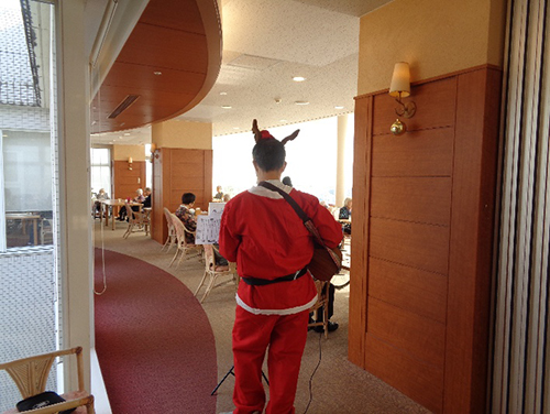 クリスマス会では、「ジングルベル」などのクリスマスソングや、讃美歌の「きよしこの夜」などを合唱しました。入居者の皆様と一緒にクリスマスを祝うことができたこと、嬉しく思います。