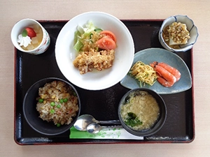 本日、1月のお誕生日会を開催いたしました。今回のメニューは中華料理で、油淋鶏、中華オードブル盛り合わせ、カニ炒飯、中華スープ、フルーツ杏仁豆腐をご提供しました。油淋鶏は甘酸っぱいタレが食欲をそそり、カニ炒飯はパラパラとした食感で、カニの風味も豊かで好評でした。