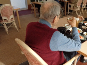 同じ食席の入居者様同士で乾杯したり、ご夫婦で顔を見合わせて乾杯したり、お誕生月の入居者様のもとへ足を運んで乾杯したり…。