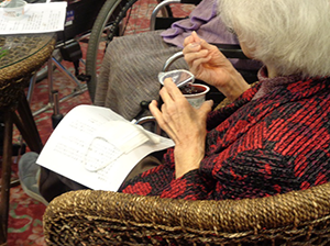 このコンサートは毎月行われており、音楽を聴いたり、ボランティアの方の歌を楽しんだり、参加者全員で歌ったりと、月に一度、音楽に触れることができるイベントです。今回は15名の入居者様が参加されました。