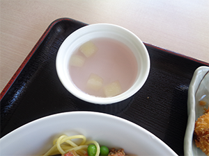 じっくり煮込んだひき肉のコクと、やわらかいナスの甘みが口いっぱいに広がる、深い味わいのボロネーゼです。スープにはオニオンスープを添えました。仕上げに散らされたパセリの香りが爽やかで、濃厚なボロネーゼと一緒に楽しめました。デザートのピーチゼリーには果肉も入っており、フルーティーでみずみずしい味わいでした。