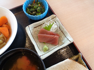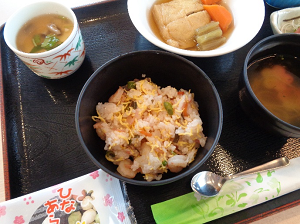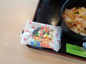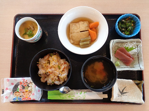 本日はひな祭りということで、夕食では桜ちらし寿司や菜の花のお浸し、刺身、ひなあられなどをご用意いたしました。