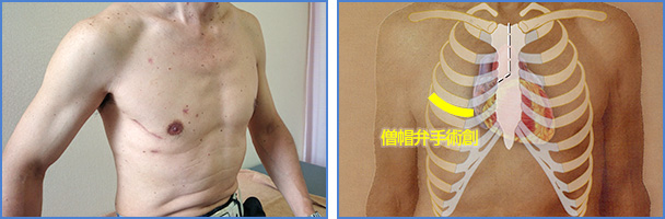 “低侵襲手術”とは“体に負担の少ない手術”という意味です。通常の心臓手術の場合,胸の真ん中にある胸骨という骨を切開する必要があります。さらに人工心肺装置を用いて心臓を拍動を停止させて行います。そのどちらか,または両方を行わない心臓手術を低侵襲心臓手術,Minimally Invasive Cardiac Surgery,略してMICS(ミックス)といいます。