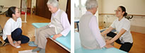 車椅子からベッドへの移動、トイレ動作などの日常生活を可能な限り自分で行える様に上下肢の運動や立ち上がりの練習を行ないます。必要に応じて居室内で「起き上がり」や「座位の動作」「移乗」の練習を行い日常生活の中でのリハビリを効果的に実践していきます。